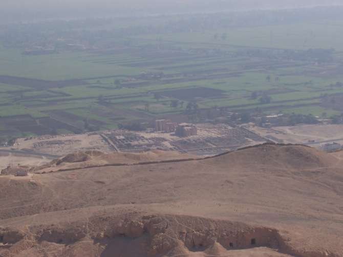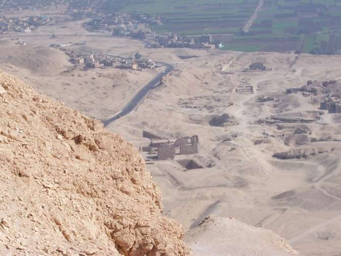 Diferentes vistas desde la cima de la montaña tebana, desde el camino del Valle de los Reyes hacia Deir el-Medina, en donde podemos observar zonas como la necrópolis del Asasif, lugar donde se hicieron enterrar los altos dignatarios de las dinastías XXV y XXVI, Deir el-Bahari o el camino hacia Deir el-Medina.