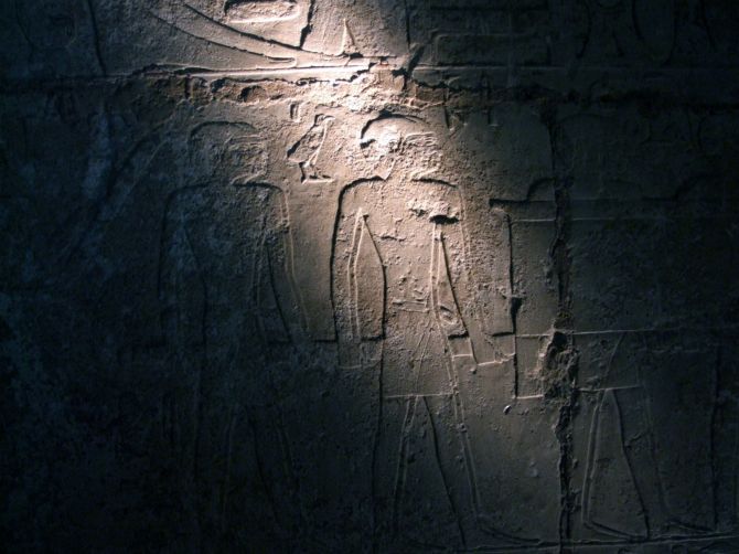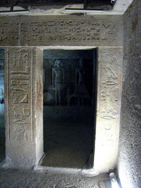 En la base del último escalón una puerta accede hacia el sur a un patio cuadrado a cielo abierto con bajorrelieves mostrando los ritos y la procesión funeraria (actualmente este patio está techado para proteger sus relieves). Al sur, un pórtico sostenido por un pilar central se abre a una cámara con estatuas. Una puerta a cada extremo conduce, a la derecha, a una pequeña habitación interior que contiene una gran estela y una mesa para las ofrendas y a la izquierda, a otra habitación que dobla en ángulo recto hacia el sur. Esta cámara parece que nunca fue terminada y está totalmente sin decorar excepto por la forma tosca de una estela y una losa para las ofrendas.